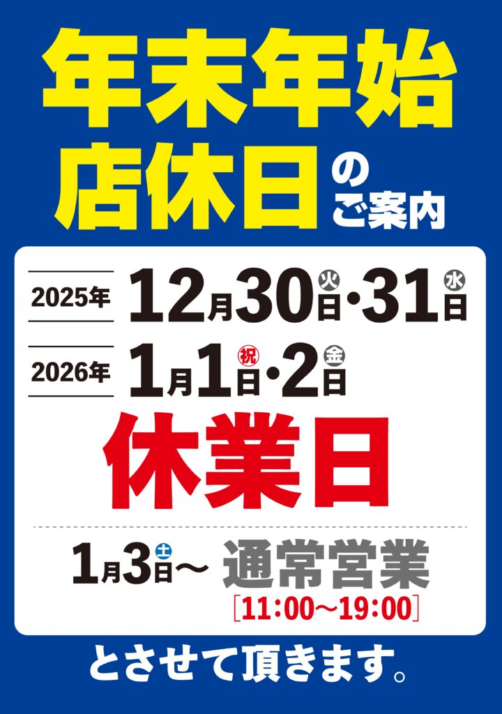 12月30日(火)~1月2日(金)まで、休業とさせていただきます。